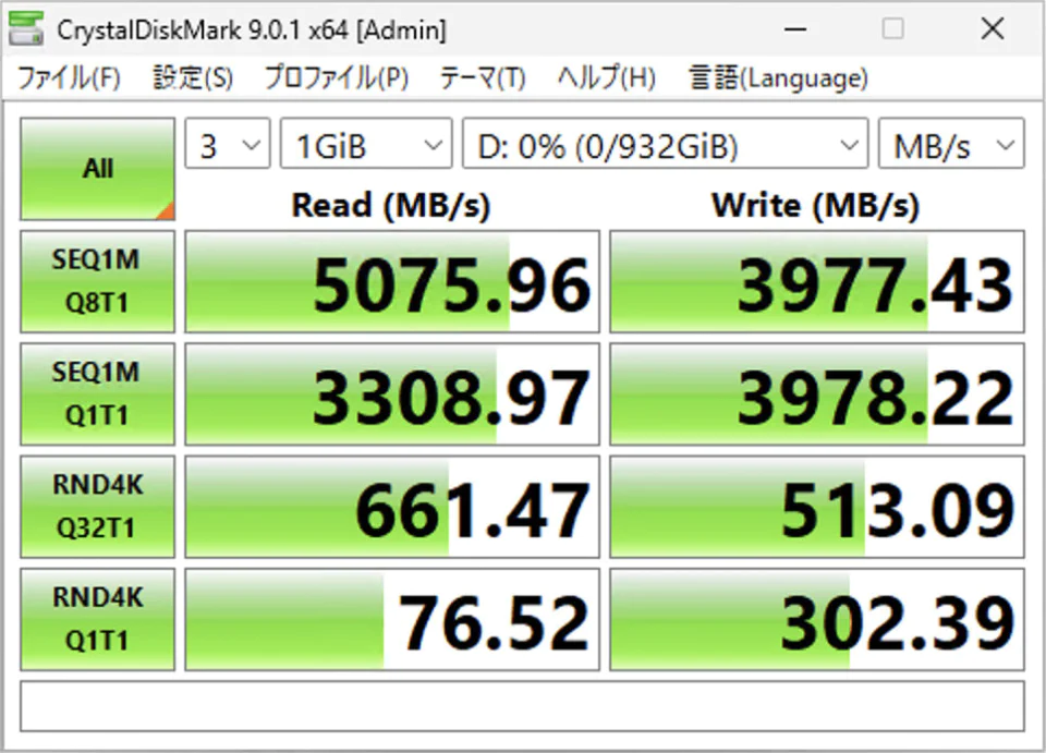 動作確認といっても、テストに使える PCIe カードが M.2 NVMe SSD 変換 PCIeカード(GLOTRENDS PA09-HS)ぐらいしかないので KIOXIA の EXCERIA PLUS G3 のベンチマークを走らせてみます。